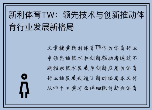 通过上述的分析,我们可以看到新利体育TW通过领先技术和创新,成功推动了体育行业的变革。智能化技术在赛事中的应用,大数据与AI技术对运动表现的提升,以及数字化平台对用户体验的革新,都是新利体育TW实现这一目标的关键所在。公司通过技术的不断创新和国际化布局,站在了体育产业发展的前沿。